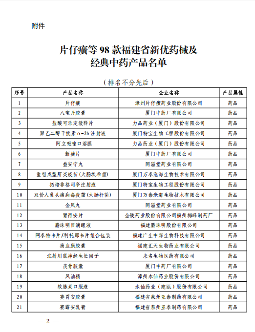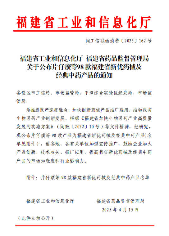 福建省工业和信息化厅福建省药品监督管理局关于公布片仔癀等98款福建省新优药械及经典中药产品的通知